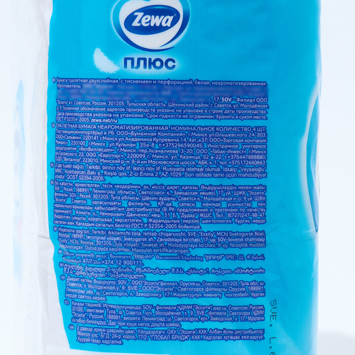 Туалетная бумага Zewa Плюс белая двухслойная 4 рул., белый, отсутствует