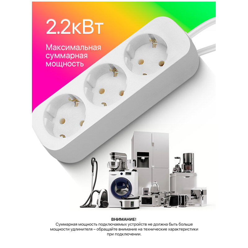 | Плюсы: | Цвет белый, длина кабеля 3м соответствует, три розетки, евровилка |