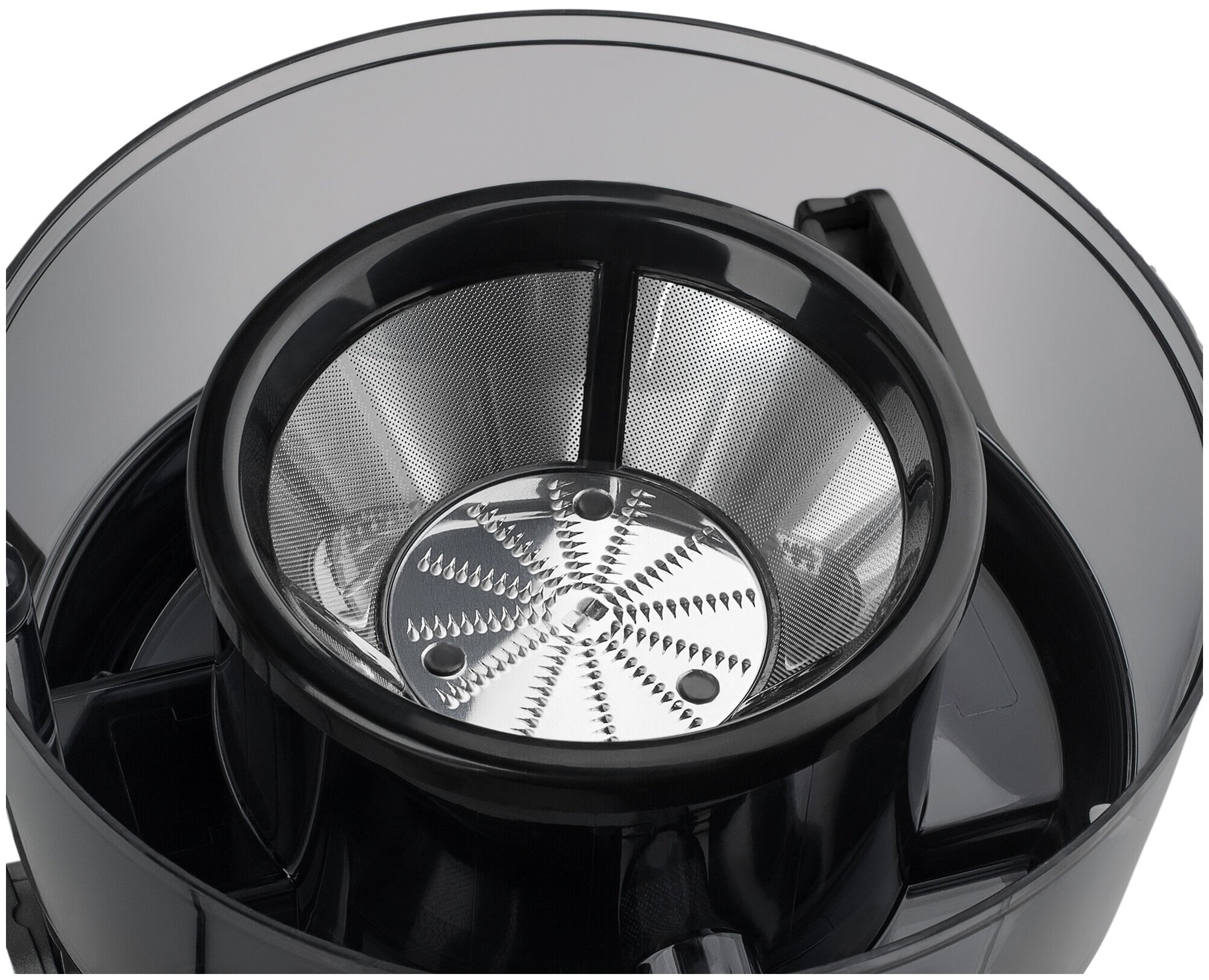 Корпус изготовлен из высококачественного металла, а фильтр из нержавеющей стали. Овощи и фрукты можно без проблем загружать целиком. Есть щетка для очистки.