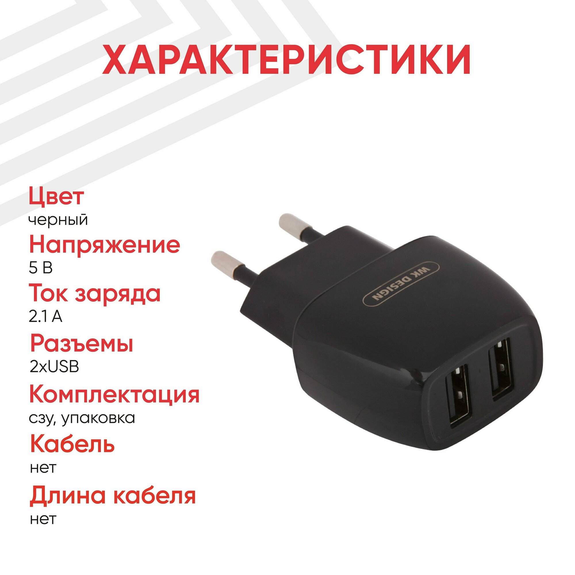 Сетевое зарядное устройство (адаптер) WK Caddy WP-U05, 2 порта USB-А, 2.1А, черный интересное: