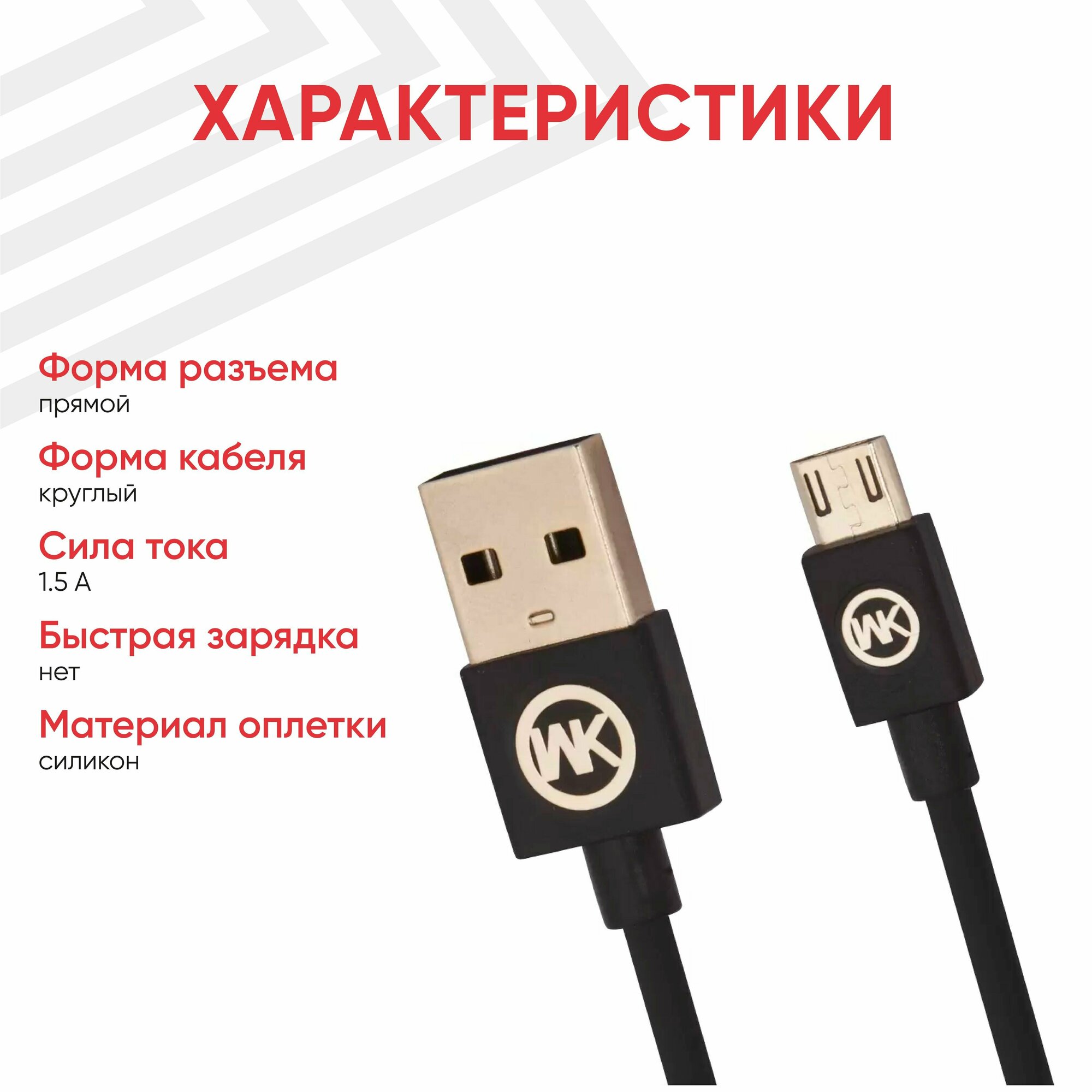 USB кабель WK WDC-052m для зарядки, передачи данных, MicroUSB, 1.5A, 1м, силикон, черный интересное: