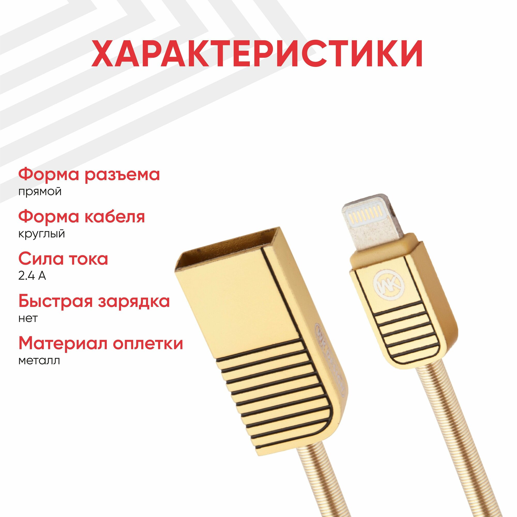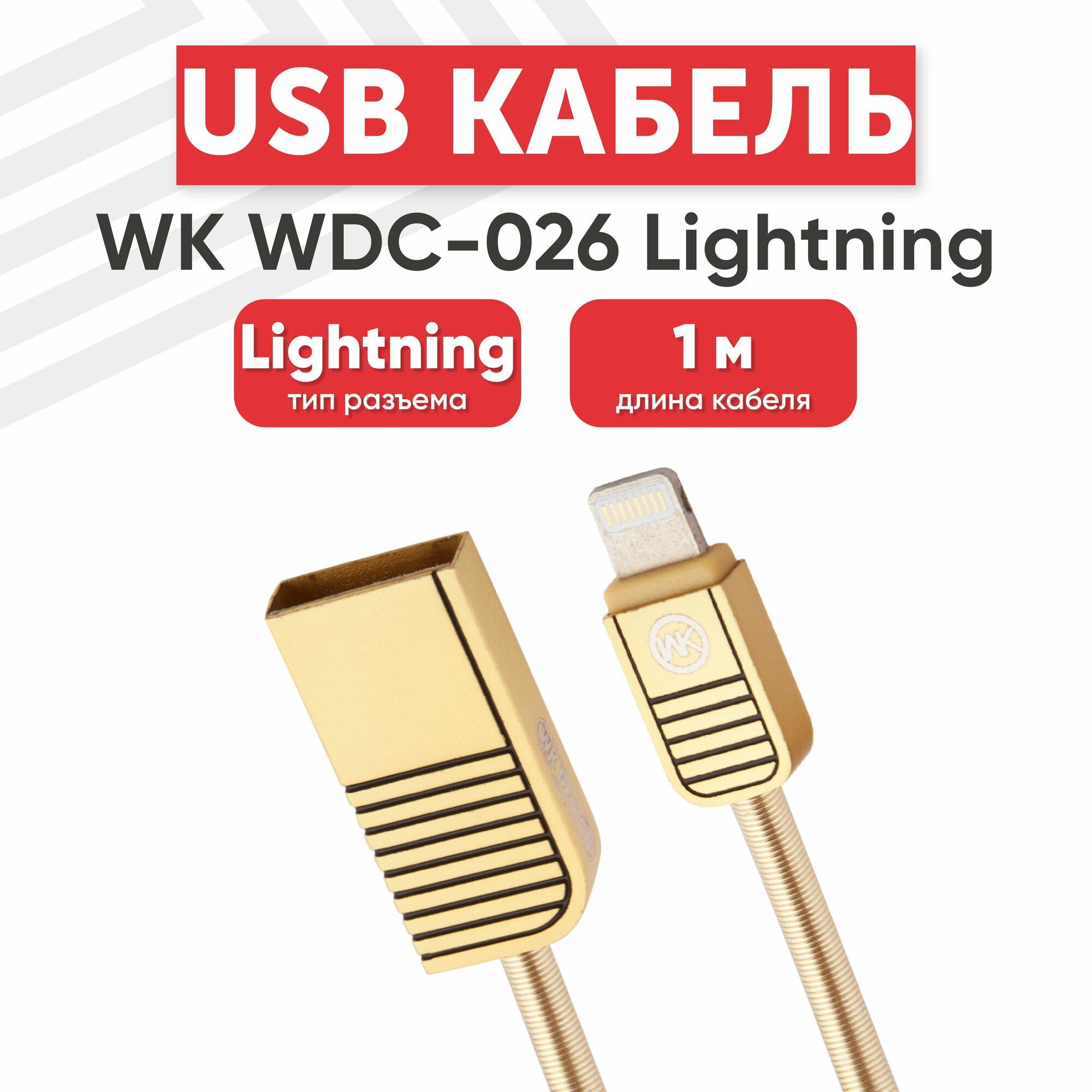 USB кабель WK LION WDC-026 для зарядки, передачи данных, Lightning 8-pin, 2.4А, 1м, металл, золотой интересное: