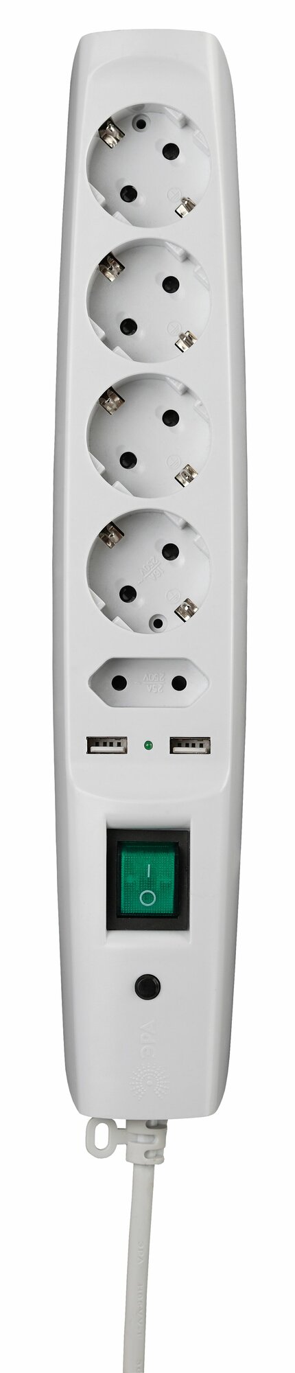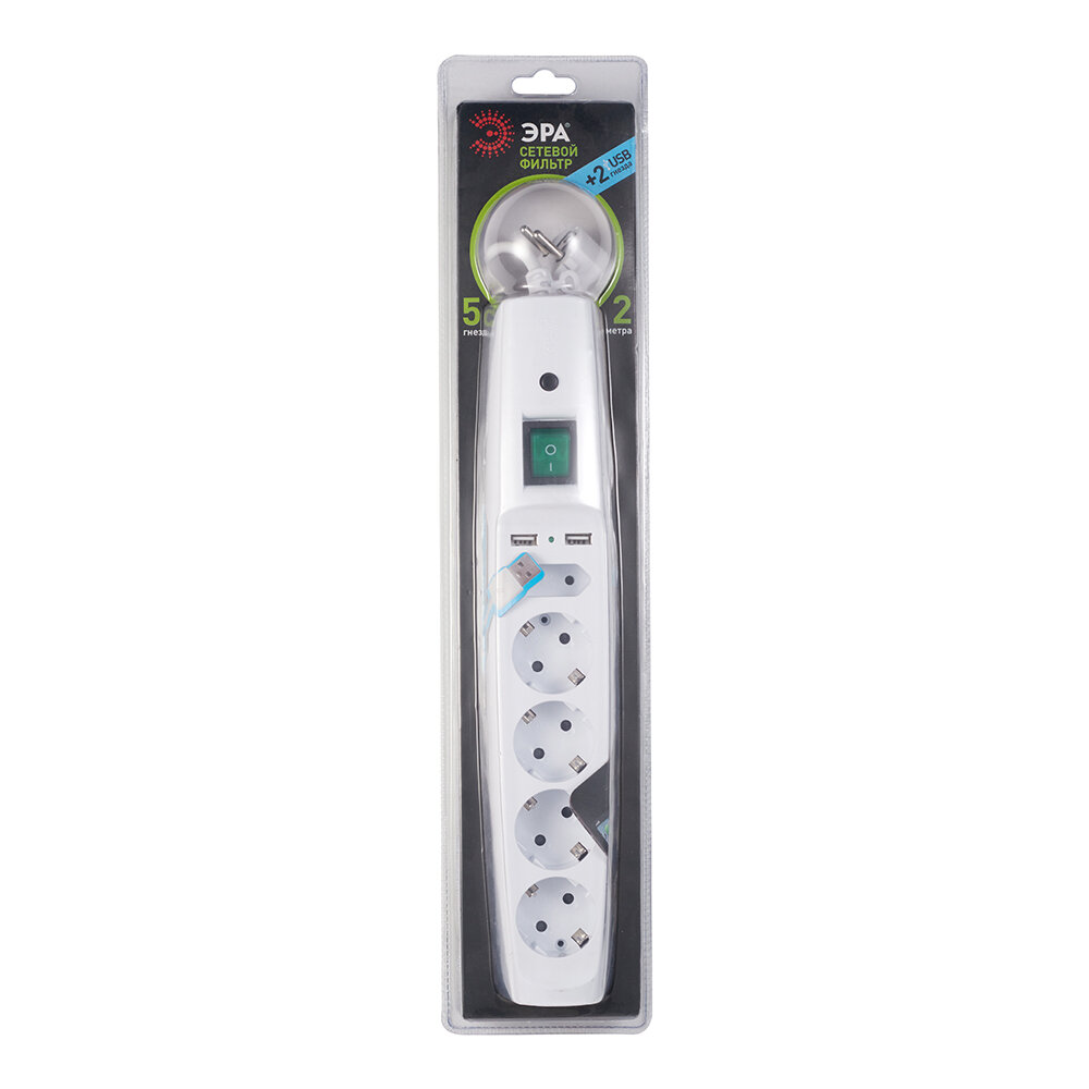 Сетевой фильтр ЭРА с надёжной защитой, заземл. и выкл. 5 розеток 2xUSB 2м 10А, Белый, SFU-5es-2m-W (