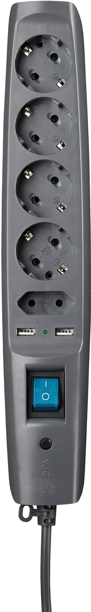Сетевой фильтр ЭРА с надёжной защитой, заземлением и выключателем 5 розеток 2м 2xUSB 10А, Чёрный, SF