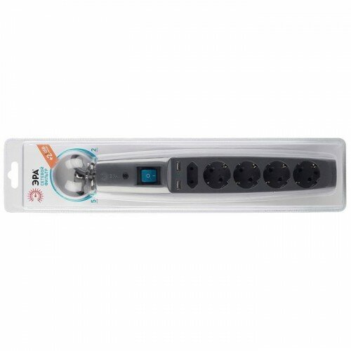 ЭРА SFU-5es-2m-B Черный Сетевой фильтр надежная защита, с защитным шторками, с выключателем, 5гн+2USB, 2м,, 10А, шторки