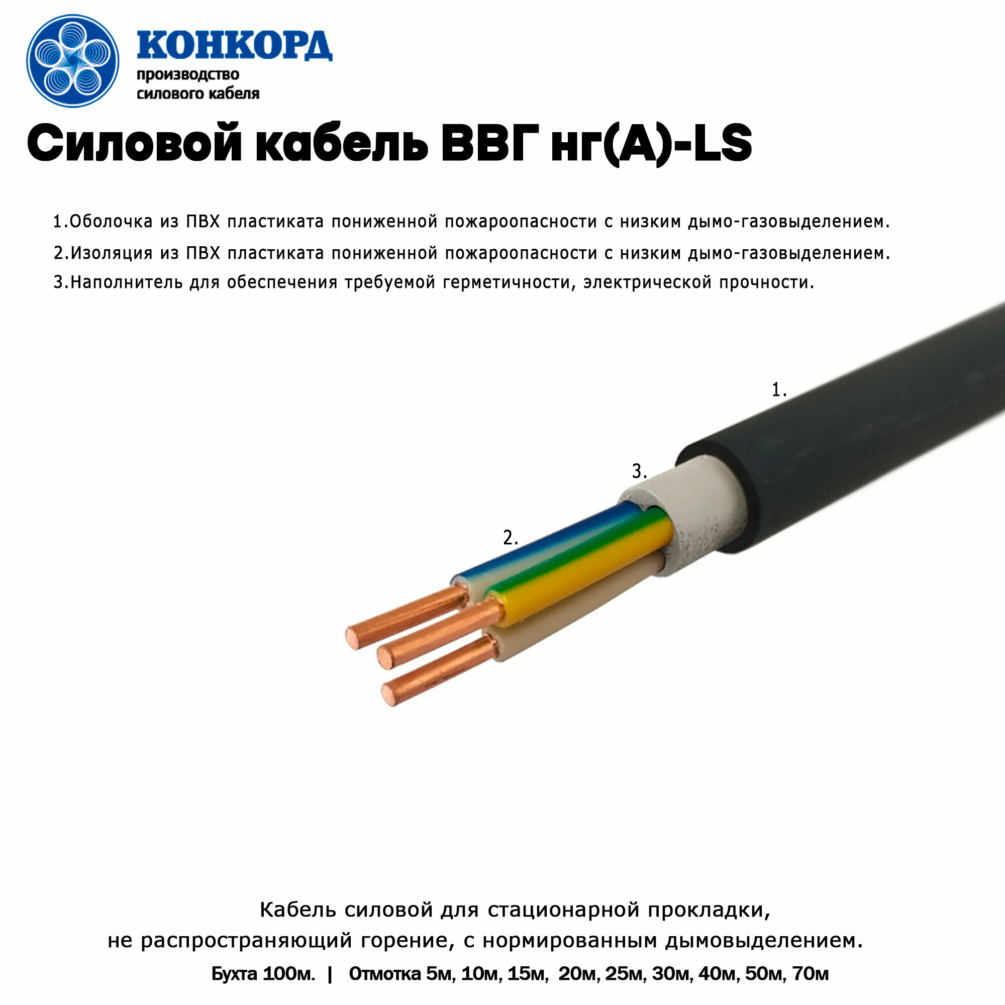 Силовой кабель ВВГнг(A)-LS 3х6 25метров Конкорд ГОСТ