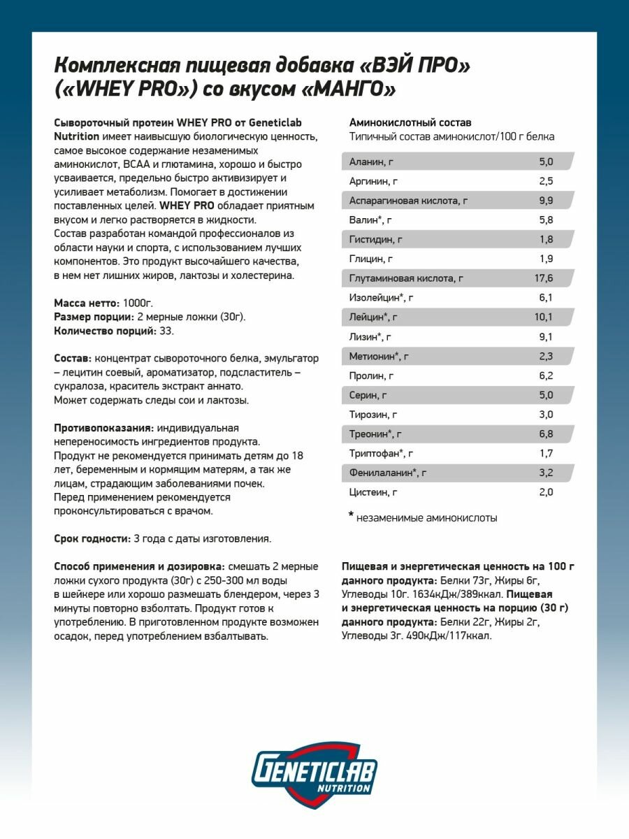 GeneticLab Nutrition WHEY PRO 1000 г Манго