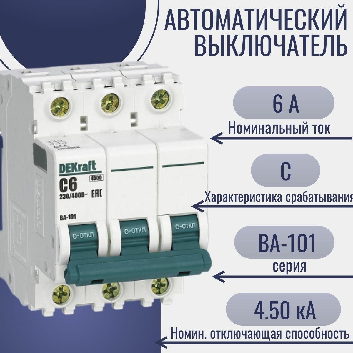 Купить Выключатель автоматический модульный 3п C 6А 4.5кА ВА-101 DEKraft 11076DEK