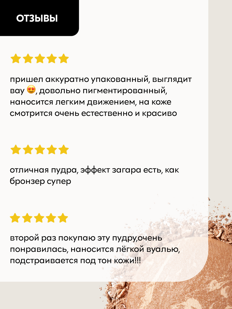 | Отзыв: | Сухой бронзатор беру впервые, сравнить не с чем. Пользуюсь еще кремовым бронзатором. Тоже нравится. Чередую их по настроению. |