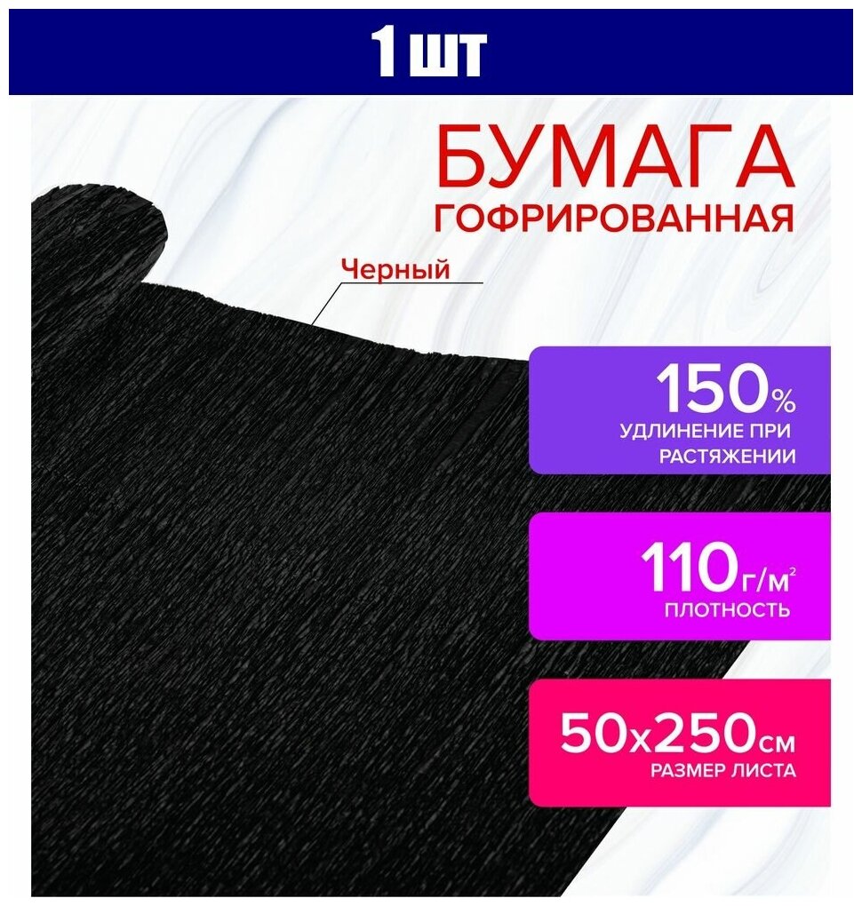 Бумага гофрированная/креповая, 110 г/м2, 50х250 см, черная, в рулоне, остров сокровищ, 112543, 112543
