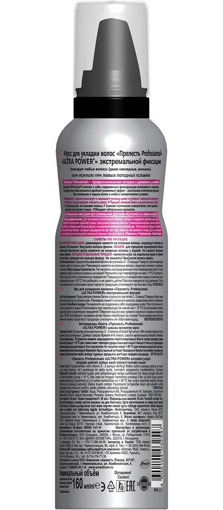 Арнест Мусс для укладки волос Прелесть Professional Ultra Power экстремальной фиксации 160 мл