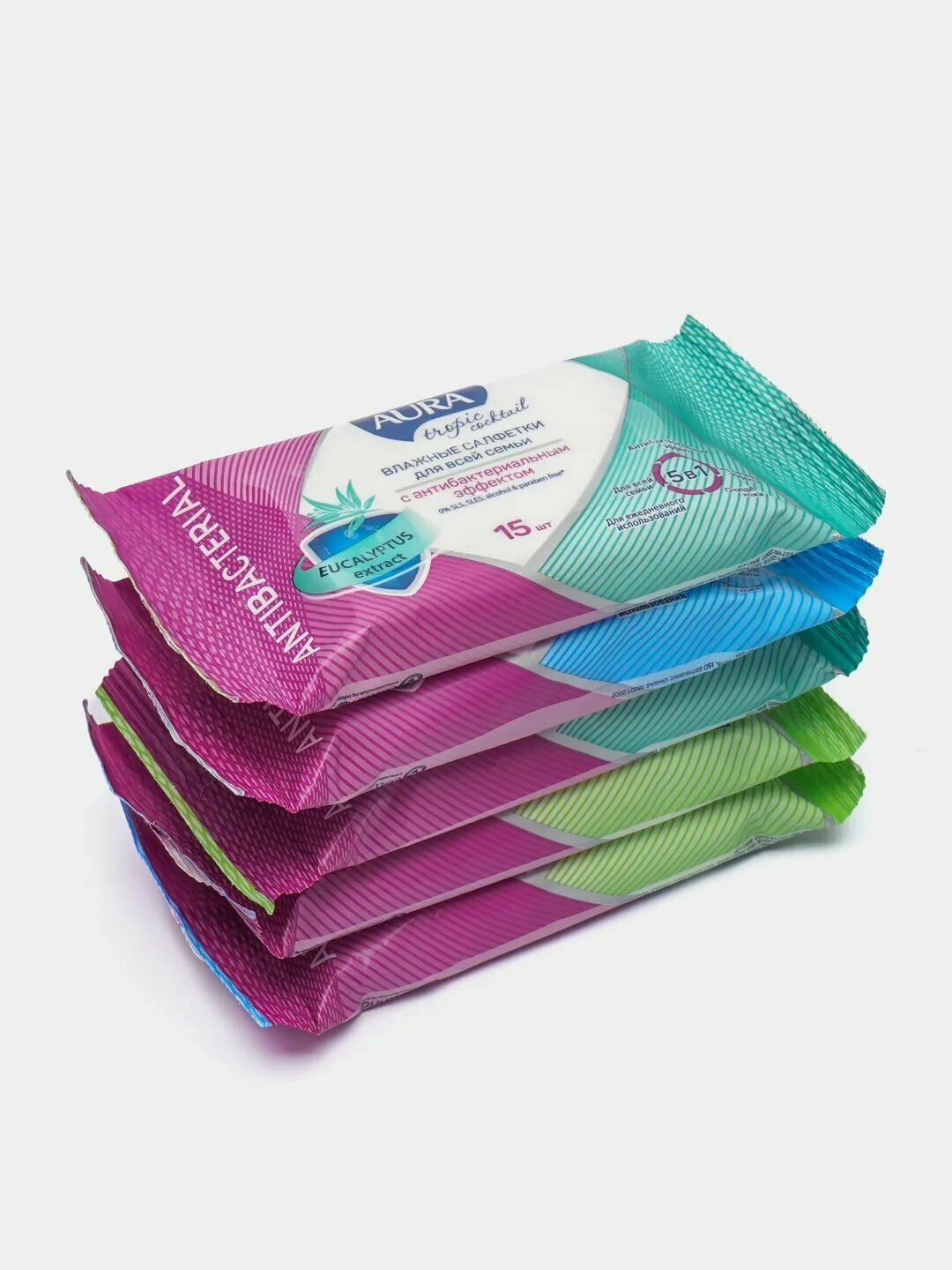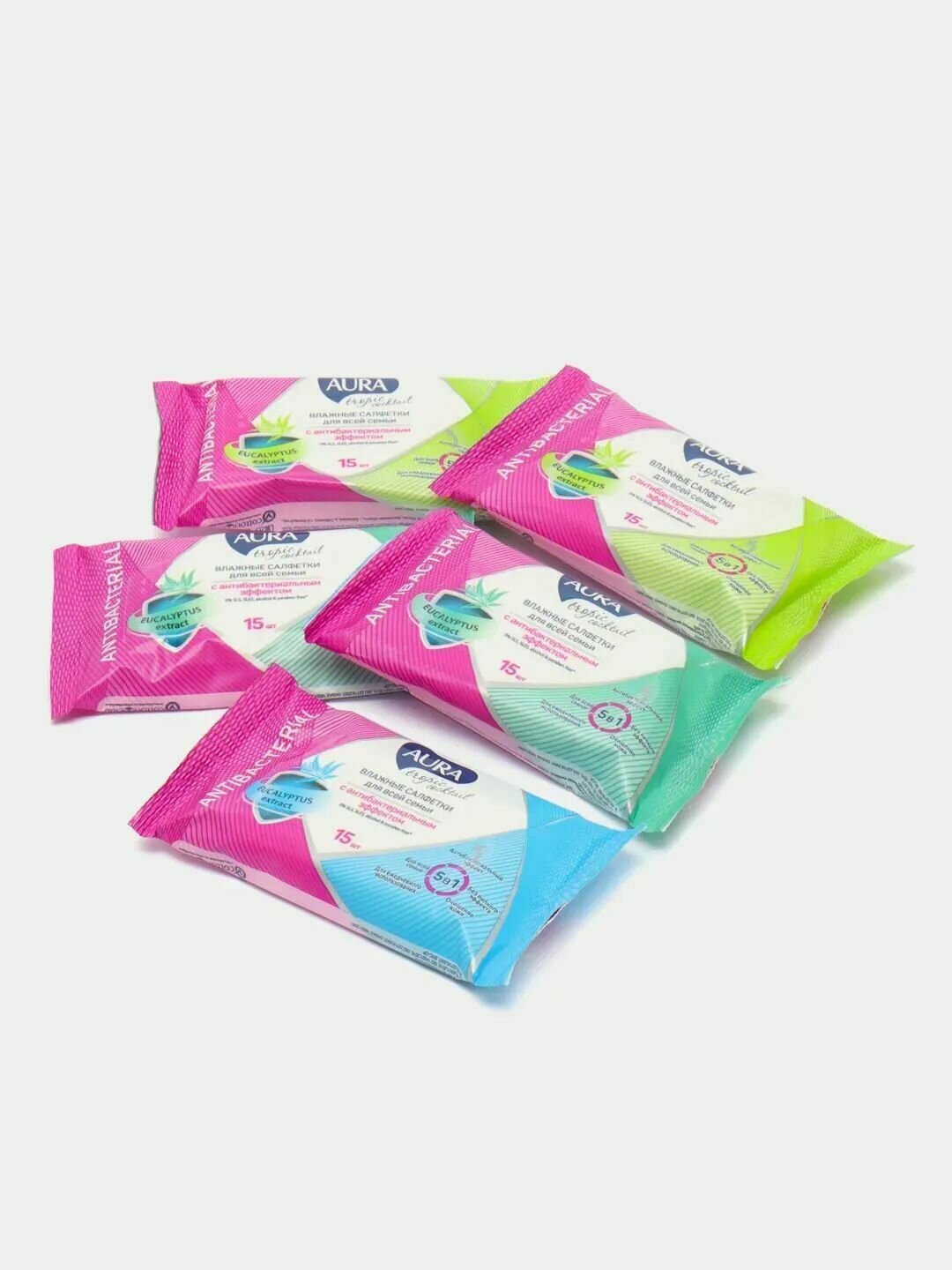 Влажные салфетки Aura Tropic Cocktail c антибактериальным эффектом, 15 шт. (5 упак.)