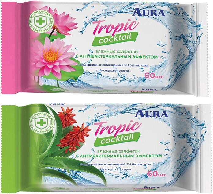 Влажные салфетки универсальные AURA Tropic cocktail 60шт с антибактериальным эффектом (2 дизайна)