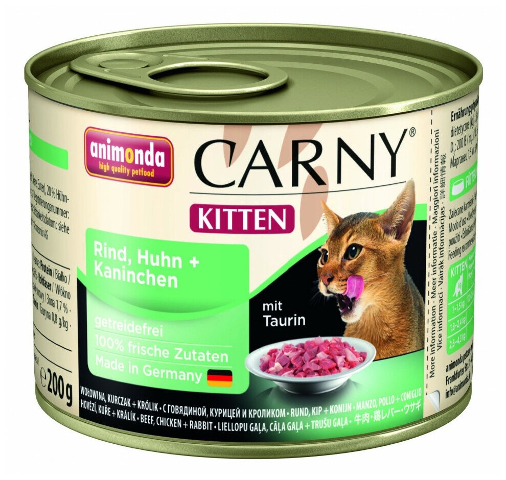 Модификации: Корм для кошек Animonda Carny Kitten для котят с говядиной, курицей и кроликом (0.2 кг) 1 шт., Корм для кошек Animonda (0.4 кг) 1 шт. Carny Kitten для котят с говядиной, курицей и кроликом, Корм для кошек Animonda (0.4 кг) 6 шт. Carny Kitten для котят с говядиной, курицей и кроликом, Корм для кошек Animonda Carny Kitten для котят с говядиной, курицей и кроликом (0.2 кг) 6 шт..