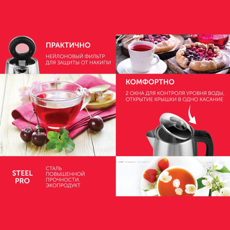 | Плюсы: | Прочный стальной корпус, привлекательный внешний вид, оптимальный объем, быстро закипает. |
