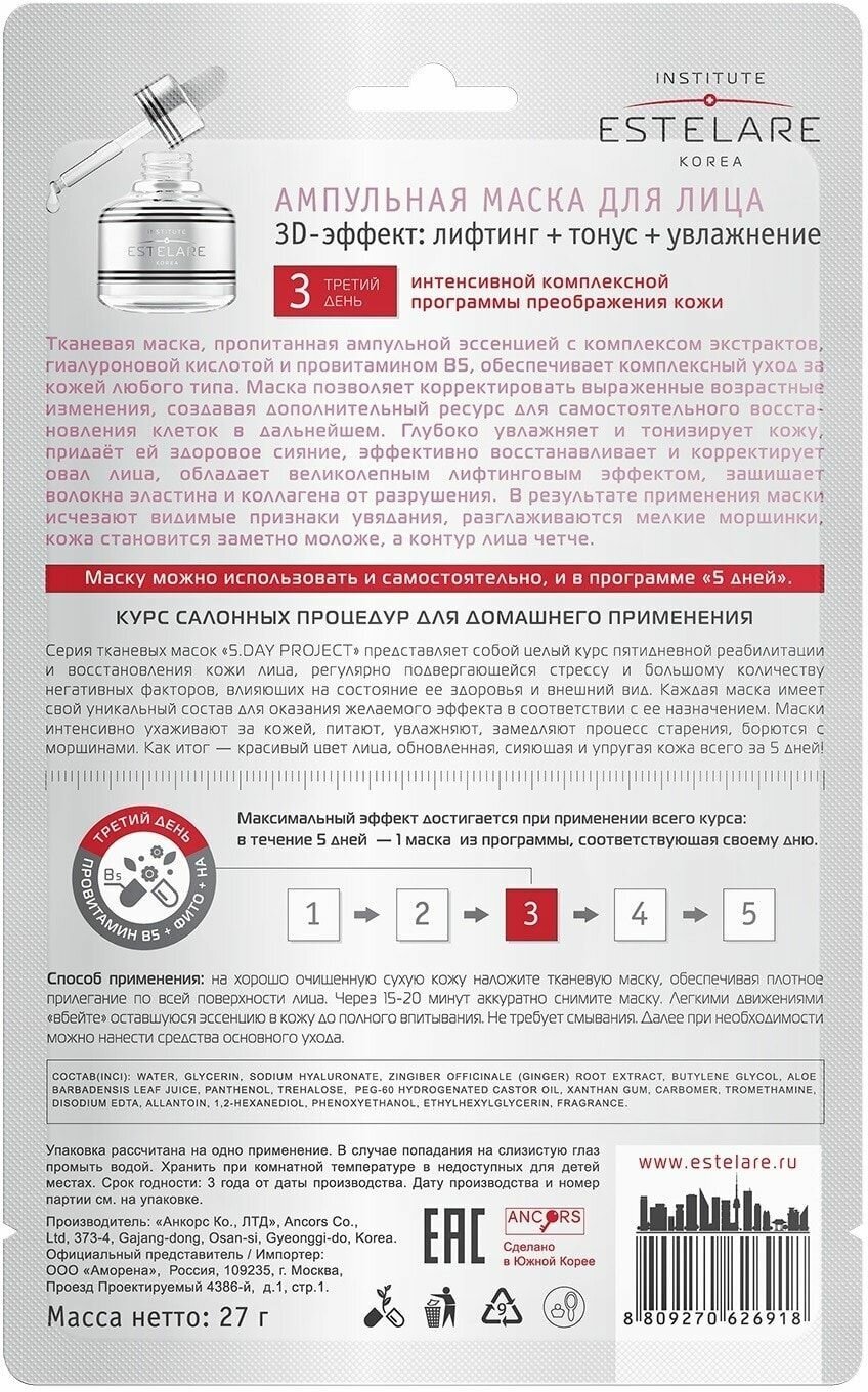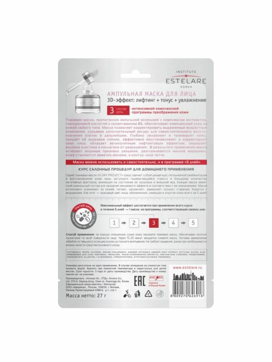 Ампульная маска (5дней) для лица 3 день"3D эффект Лифтинг+Тонус+Увлажнение", 27 г