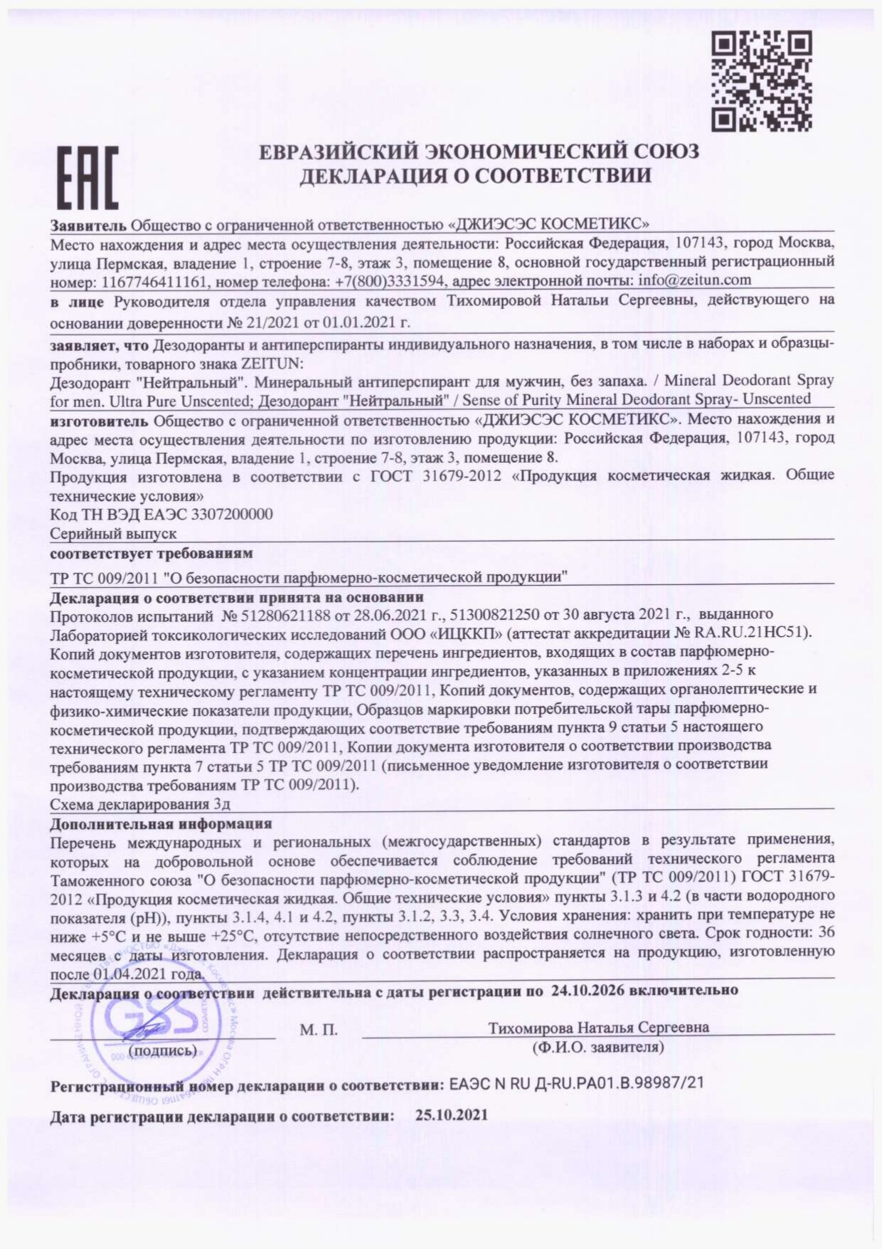 Минеральный дезодорант-антиперспирант ZEITUN Нейтральный без запаха, 150 мл