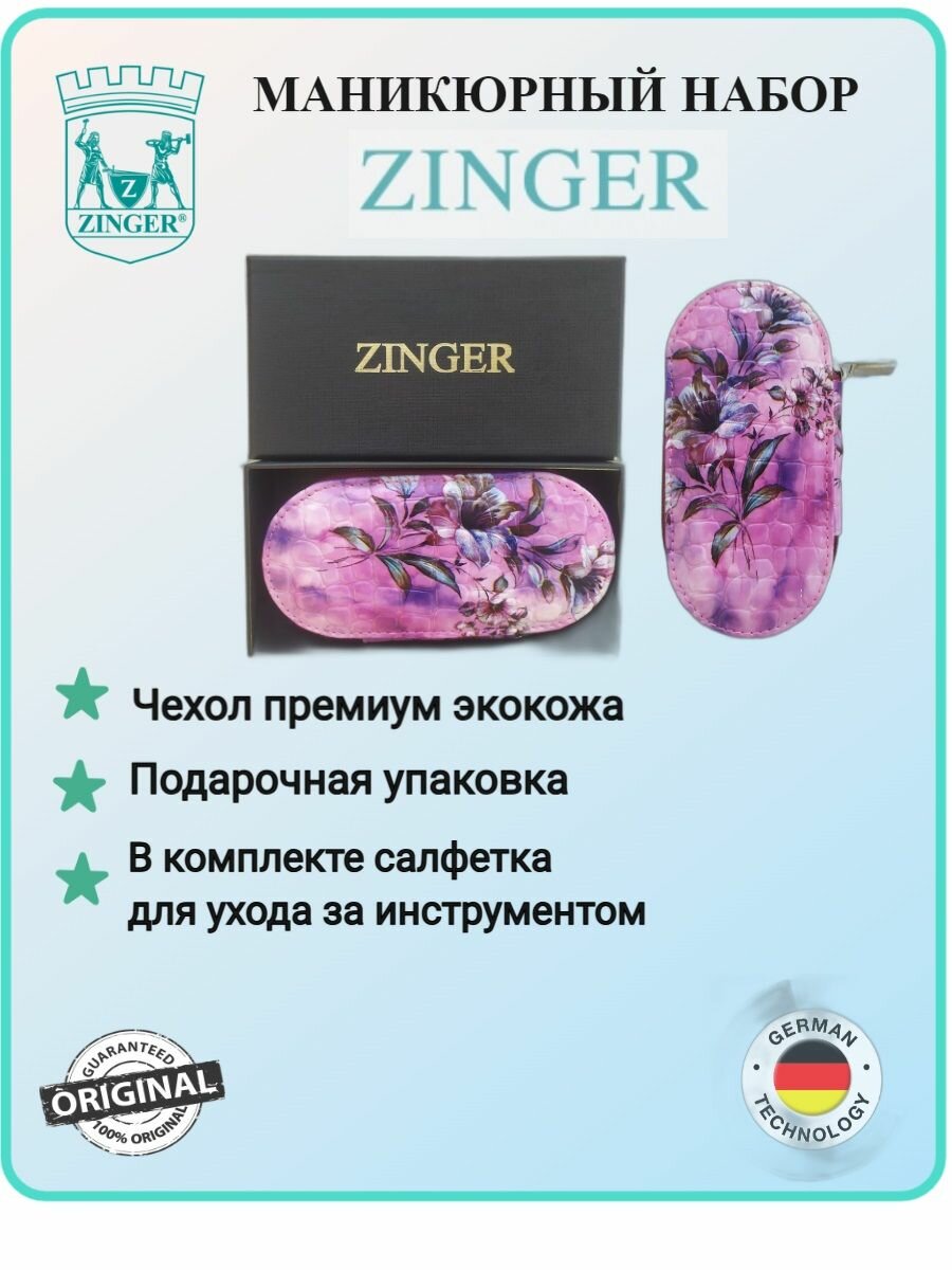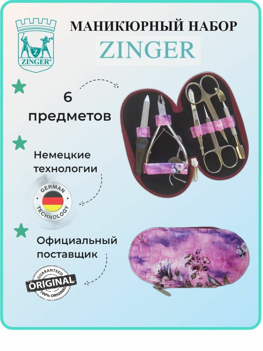 Маникюрный набор ZINGER на молнии MS-7104, 6 предметов, чехол фиолетовые цветы в золоте