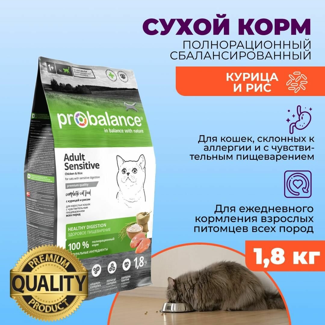 Корм ProBalance Sensitive для взрослых кошек с чувствительным пищеварением, с курицей и рисом, 1,8 кг
