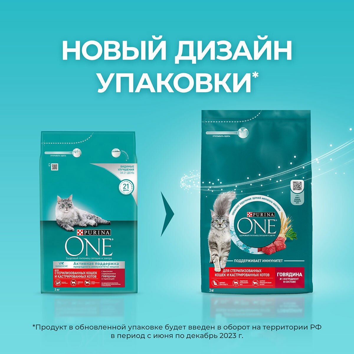 Сухой корм Purina ONE для стерилизованных кошек и котов с говядиной и пшеницей, Пакет, 3 кг,Для взрослых кошек