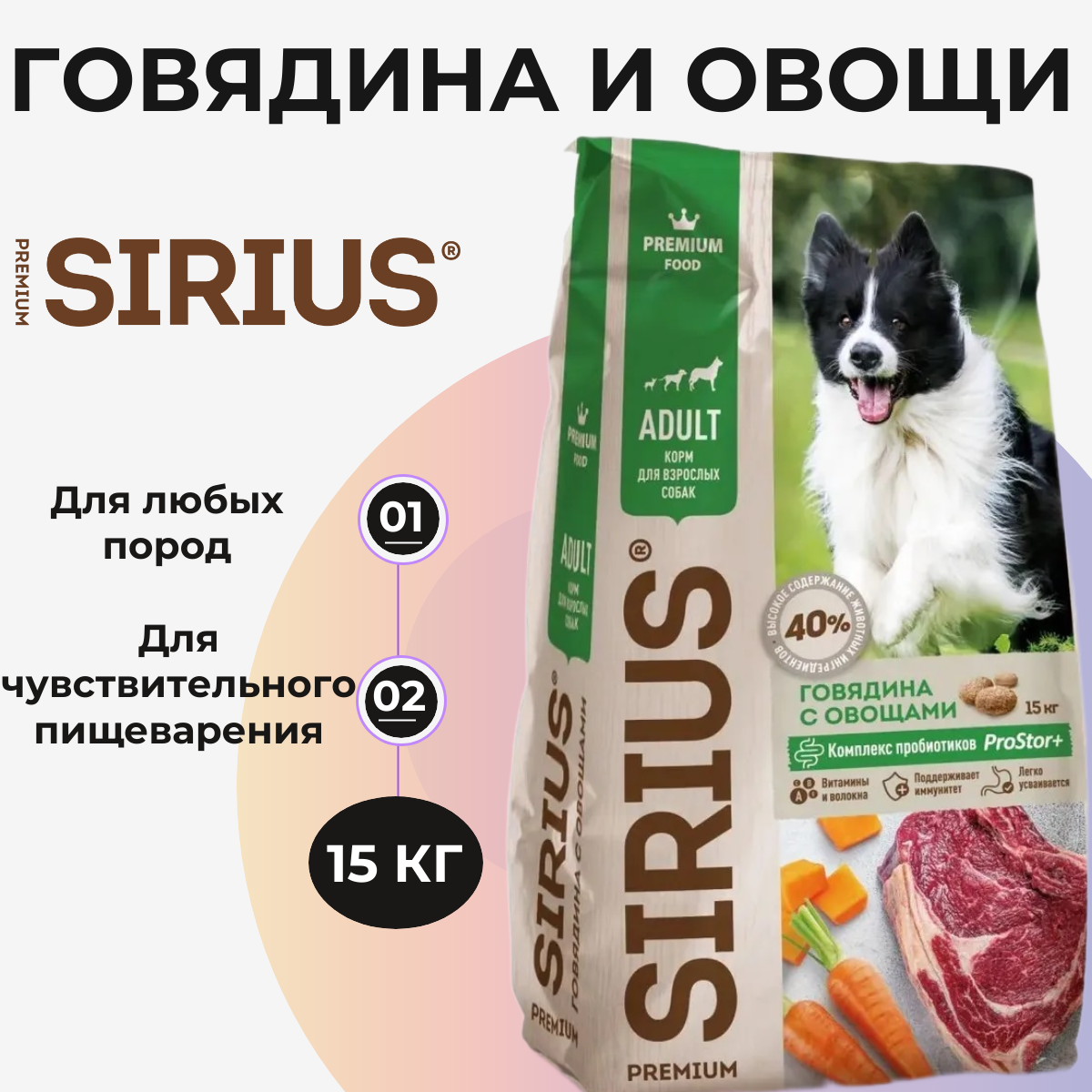 Полнорационный сухой корм для взрослых собак всех пород, говядина с овощами SIRIUS 15 кг
