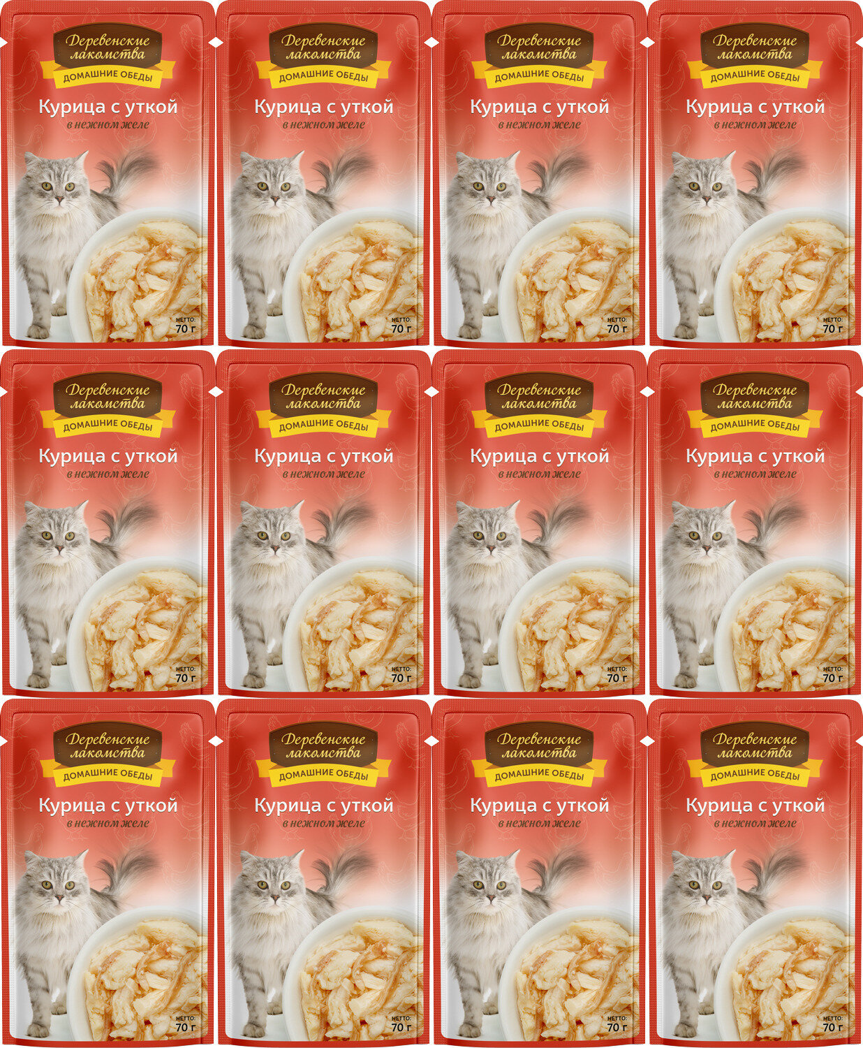 Влажный корм для кошек Деревенские лакомства, курица с уткой в нежном желе, пауч 70 г*12 шт