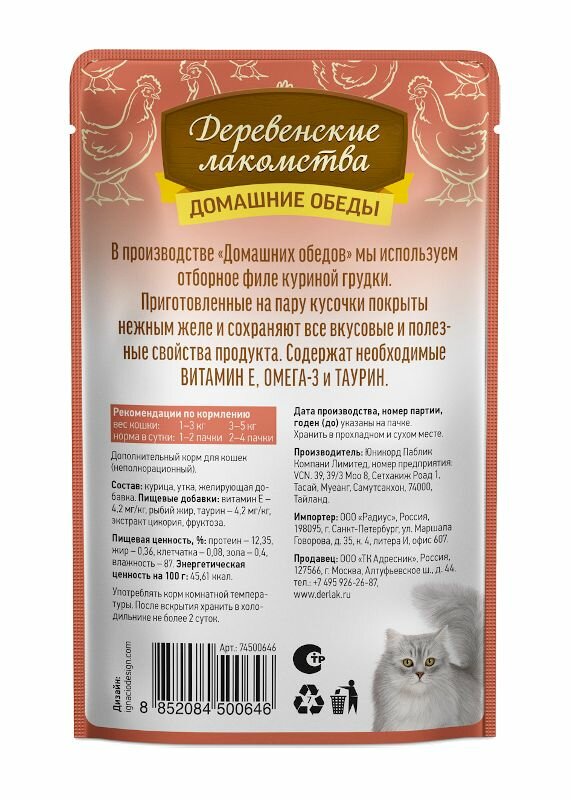 Влажный корм для кошек Деревенские лакомства Домашние обеды, беззерновой, с курицей, с уткой 70 г (кусочки в желе)