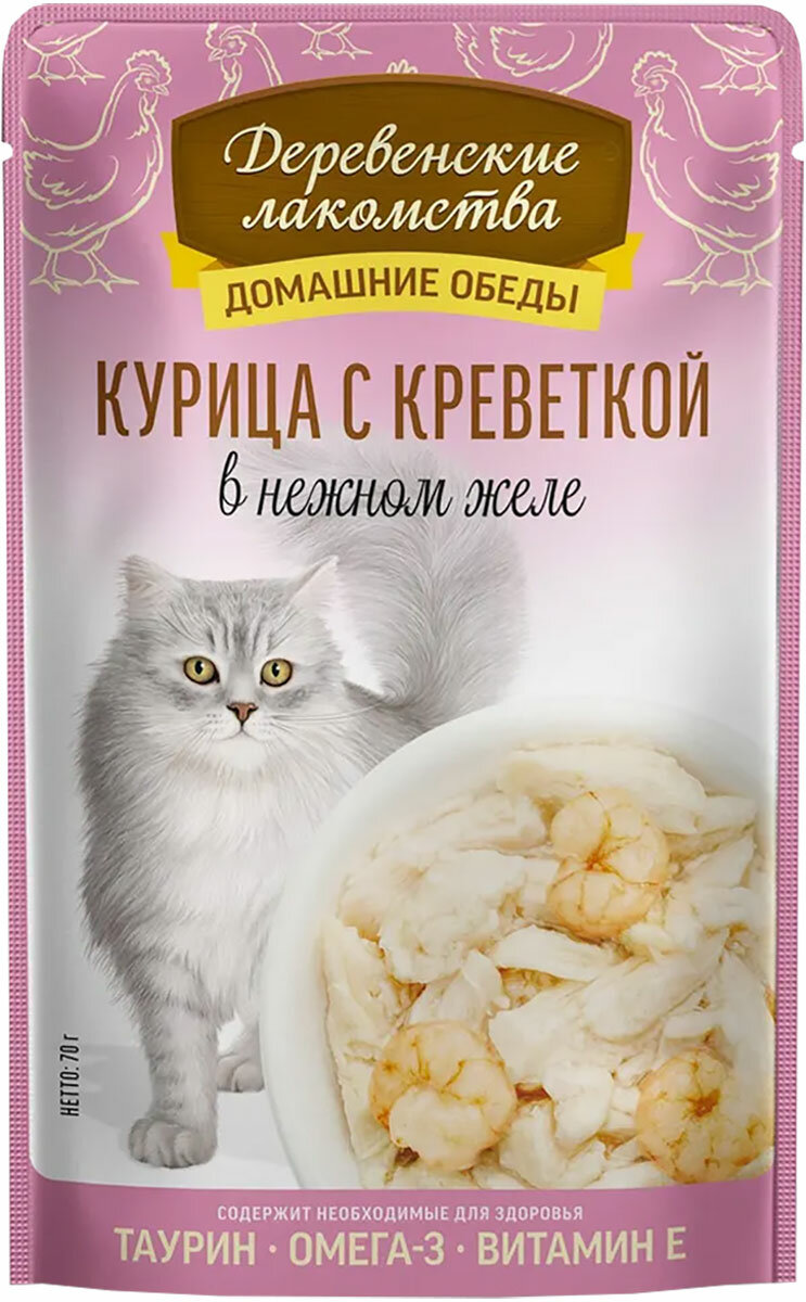 Деревенские лакомства домашние обеды для взрослых кошек с курицей и креветкой в нежном желе 70 гр (70 гр х 12 шт)
