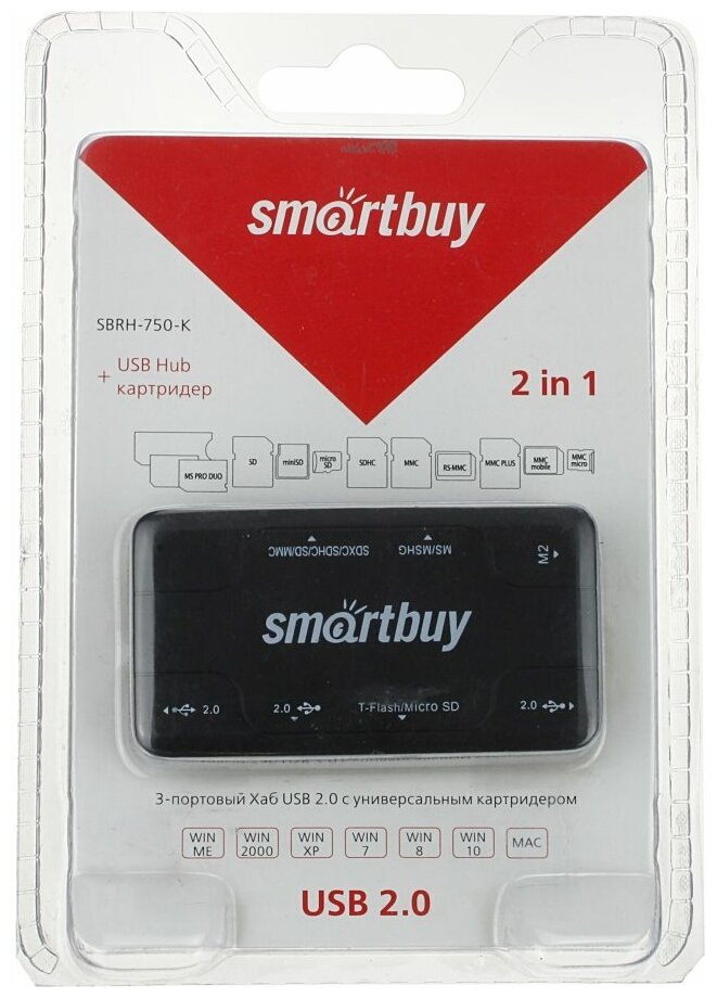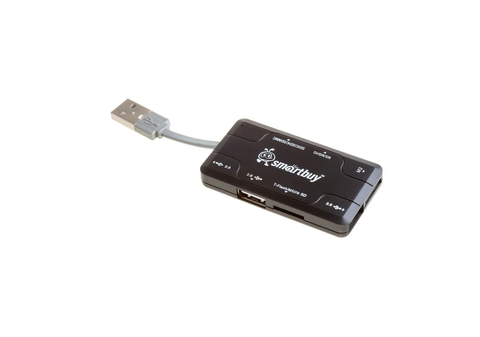Картридер + Хаб Smartbuy 750, USB 2.0 3 порта+SD/microSD/MS/M2 Combo, черный (SBRH-750-K)
