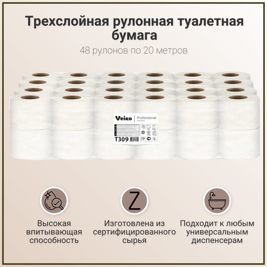 T309 Туалетная бумага в стандартных рулонах Veiro Professional Premium трёхслойная (48 рул х 20 м)