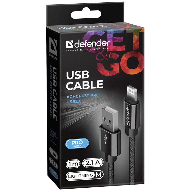 Купить Кабель Defender ACH01-03T PRO USB(AM) - Lightning(M), для Apple, 2.1A output, в оплетке, 1м, черный