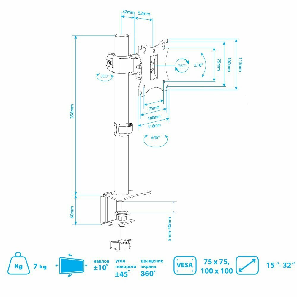 Кронштейн для мониторов Arm Media LCD-T01 black 15-32, max 7 кг, 4 ст свободы, наклон ±10°, поворот ±45°, высота штанги 358 мм, max VESA 100x100 мм