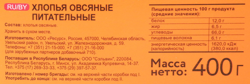 Хлопья овсяные Увелка питательные, 400 г