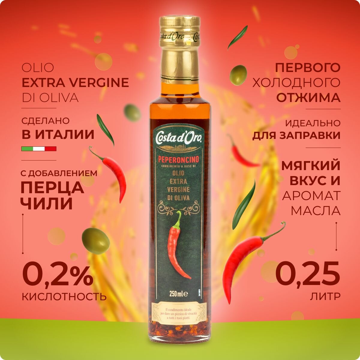 Купить Масло оливковое COSTA D'ORO Extra Virgin нерафинированное высшего качества со вкусом и ароматом перца чили 250 мл стеклянная бутылка
