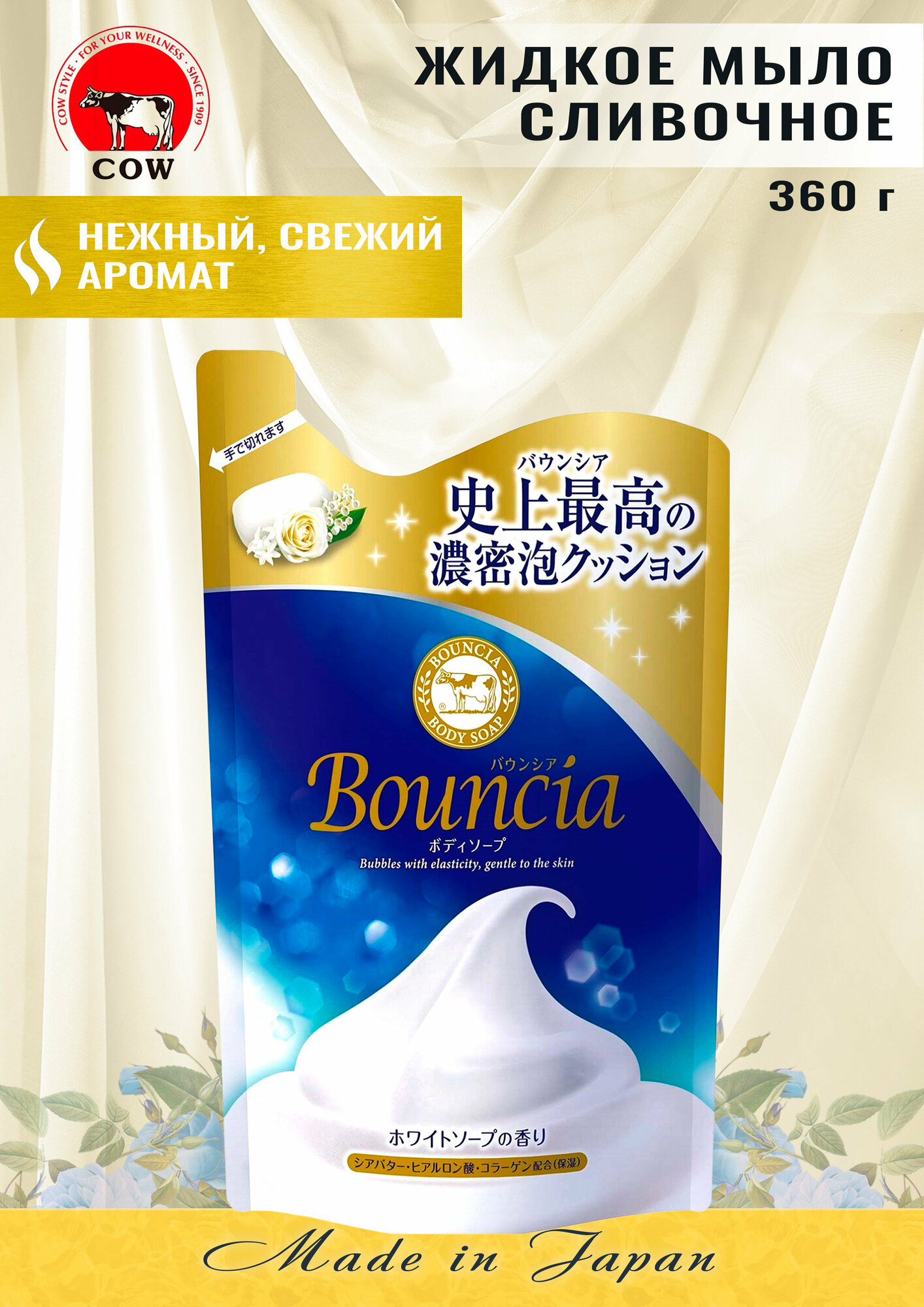 Cow Brand Bouncia Сливочное жидкое мыло для рук и тела с гиалуроновой кислотой и коллагеном аромат свежести 360 мл запасной блок