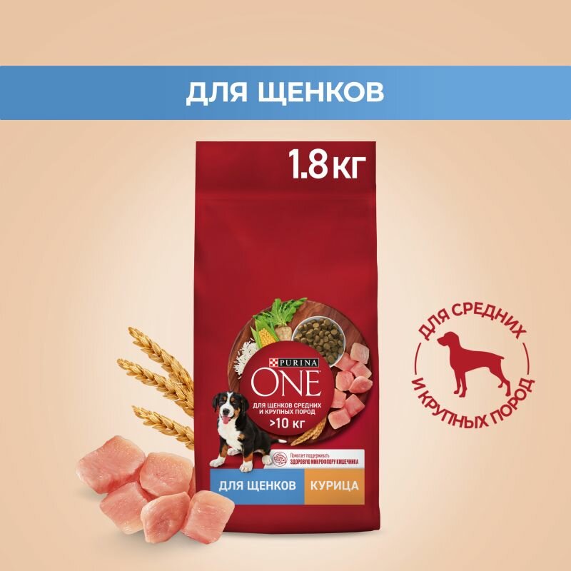PURINA ONE 1,8 кг сухой корм для щенков средних и крупных пород, с высоким содержанием курицы и с рисом