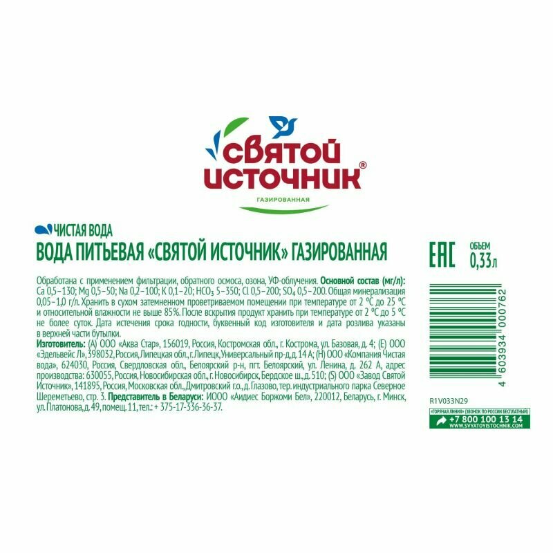 Вода питьевая Святой Источник газированная, ПЭТ 0.33 л