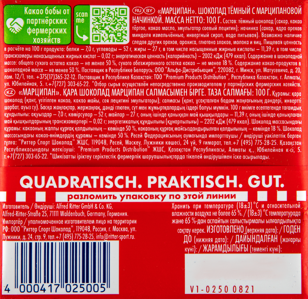 Ниже Вы можете прочитать отзывы на Шоколад Ritter Sport горький "марципан" 100 г, ознакомится с подробными характеристиками, посмотреть интересные обзоры и фотографии на Шоколад Ritter Sport горький "марципан" 100 г.