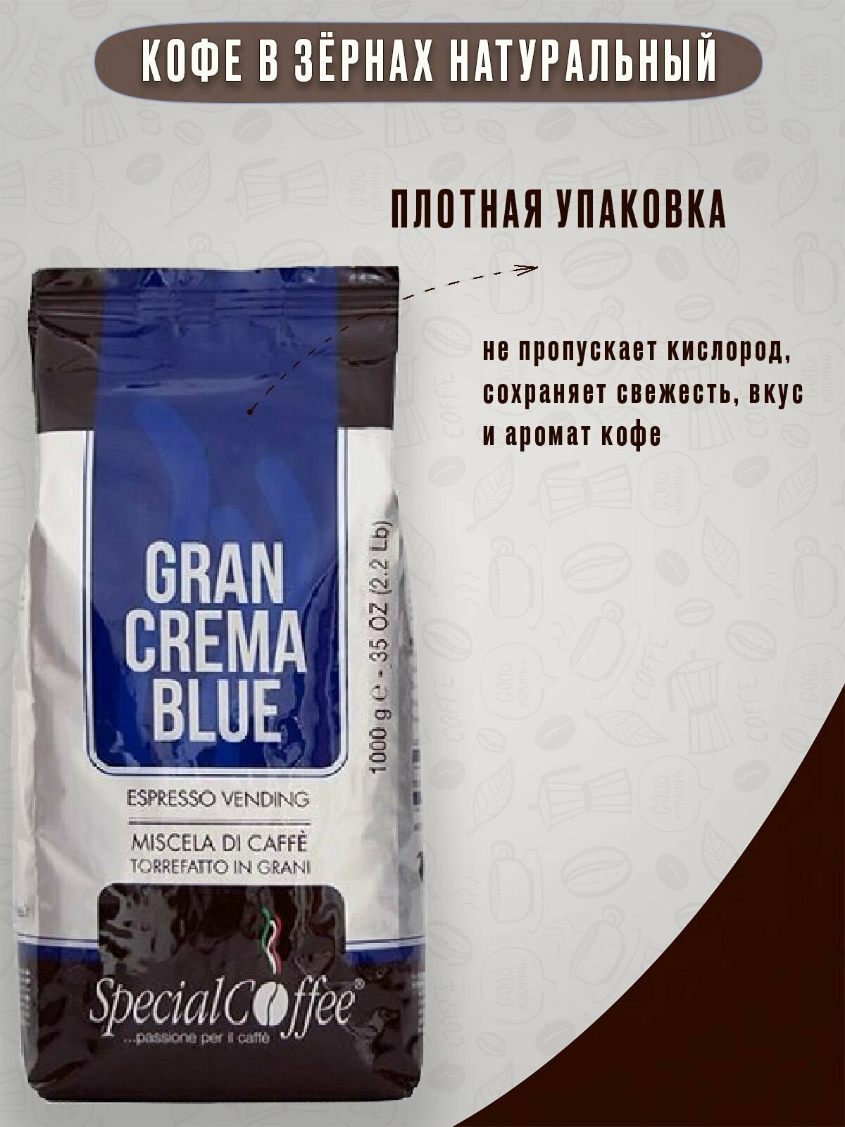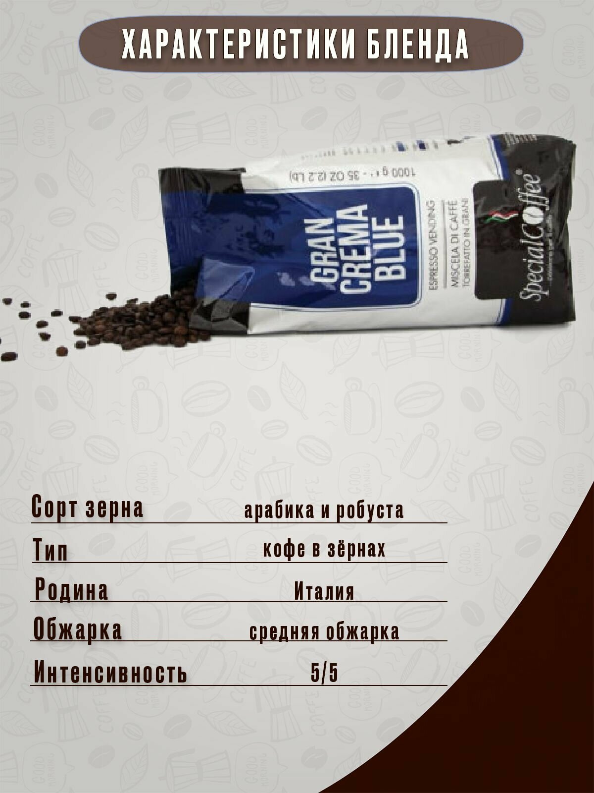 Итальянский кофе в зернах SPECIAL COFFEE Gran Crema Blue (1 кг) - 15% арабики / 85% робусты средней обжарки для любой кофеварки