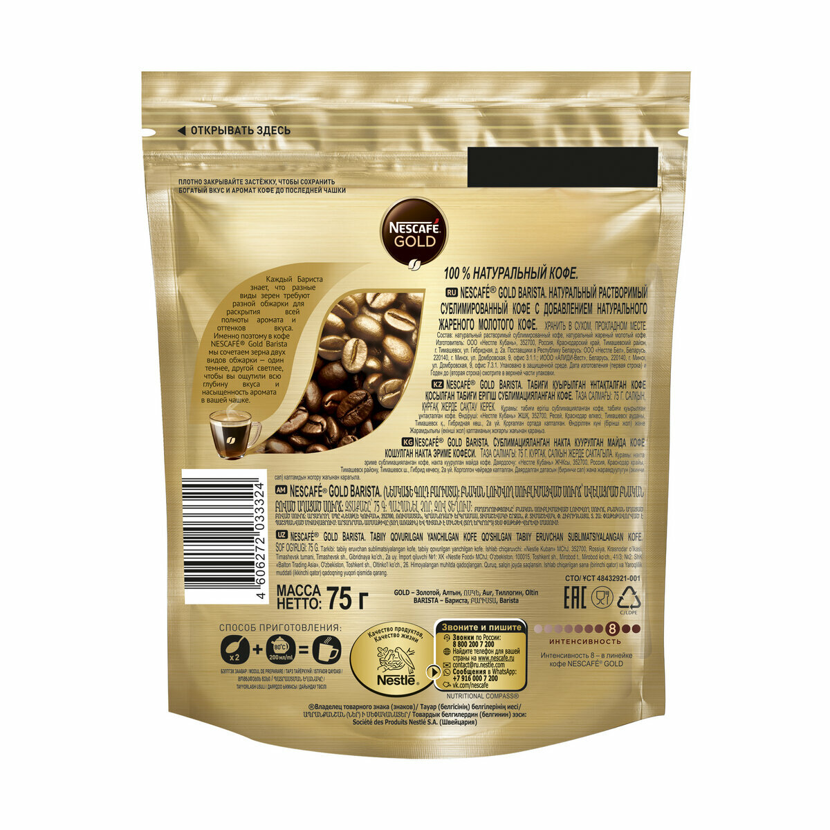 Кофе растворимый Nescafe "Gold Barista", сублимированный, с молотым, тонкий помол, мягкая упаковка, 75г