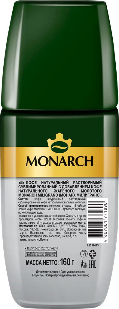 Кофе растворимый Jacobs «Monarch »Millicano", сублимированный, с молотым, стеклянная банка, 160г