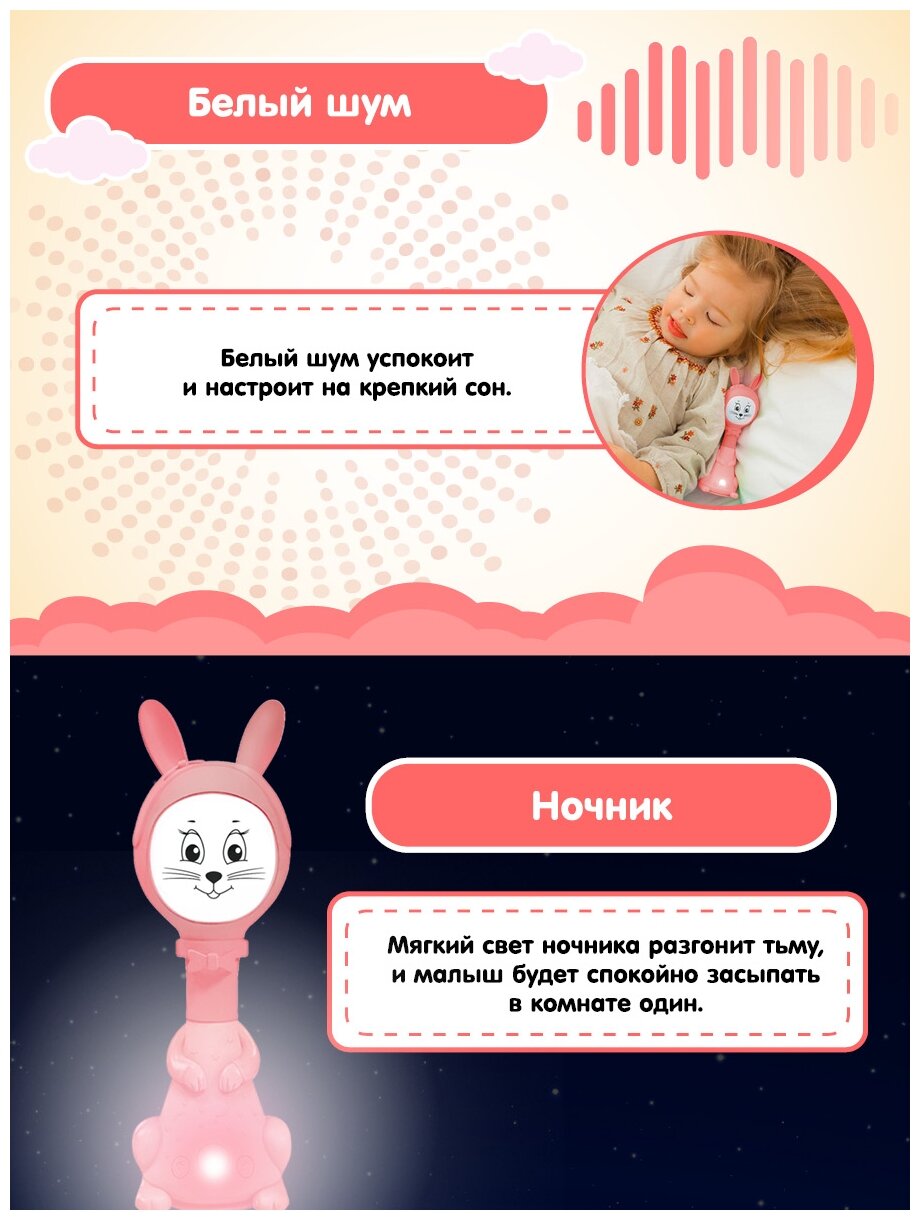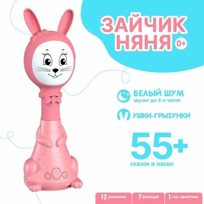 Интерактивный Музыкальный Умный Зайка Няня Белый шум и ночник Розовый