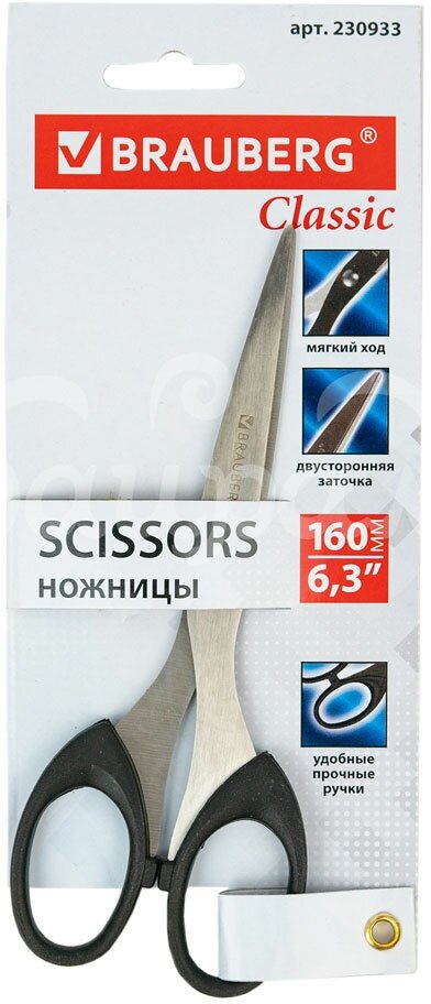 Ножницы BRAUBERG "Classic", 160 мм, черные, классической формы, 2-х сторонняя заточка, 230933 (цена за 1 ед.товара)