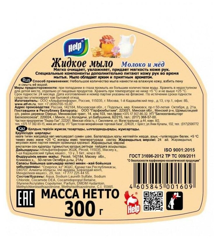 Мыло жидкое Help Молоко и мед 300мл, флакон с дозатором флип-топ, 1шт.