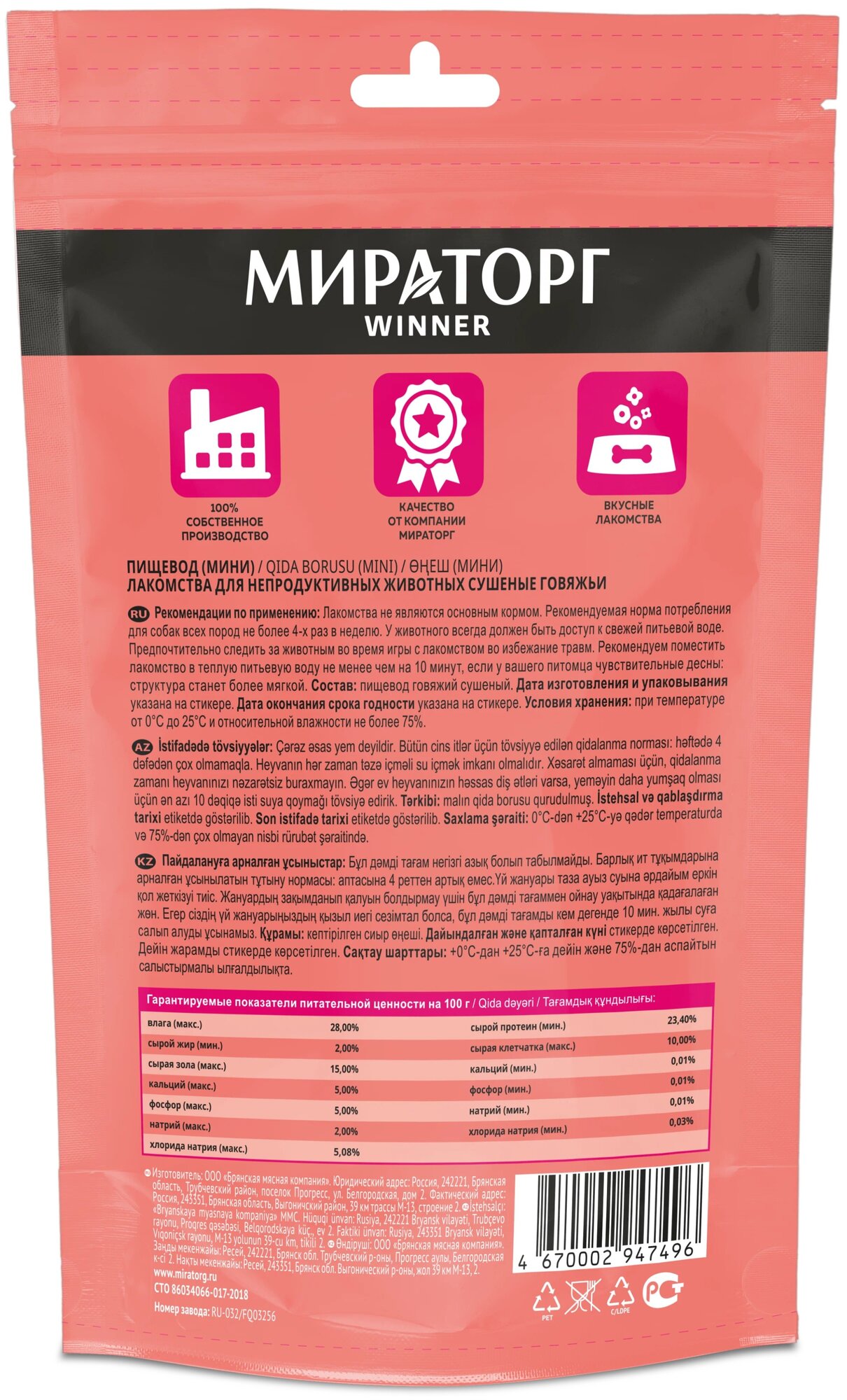 Winner Мираторг Лакомства для собак сушеные, мясо пищевода, 1х12, 60 гр