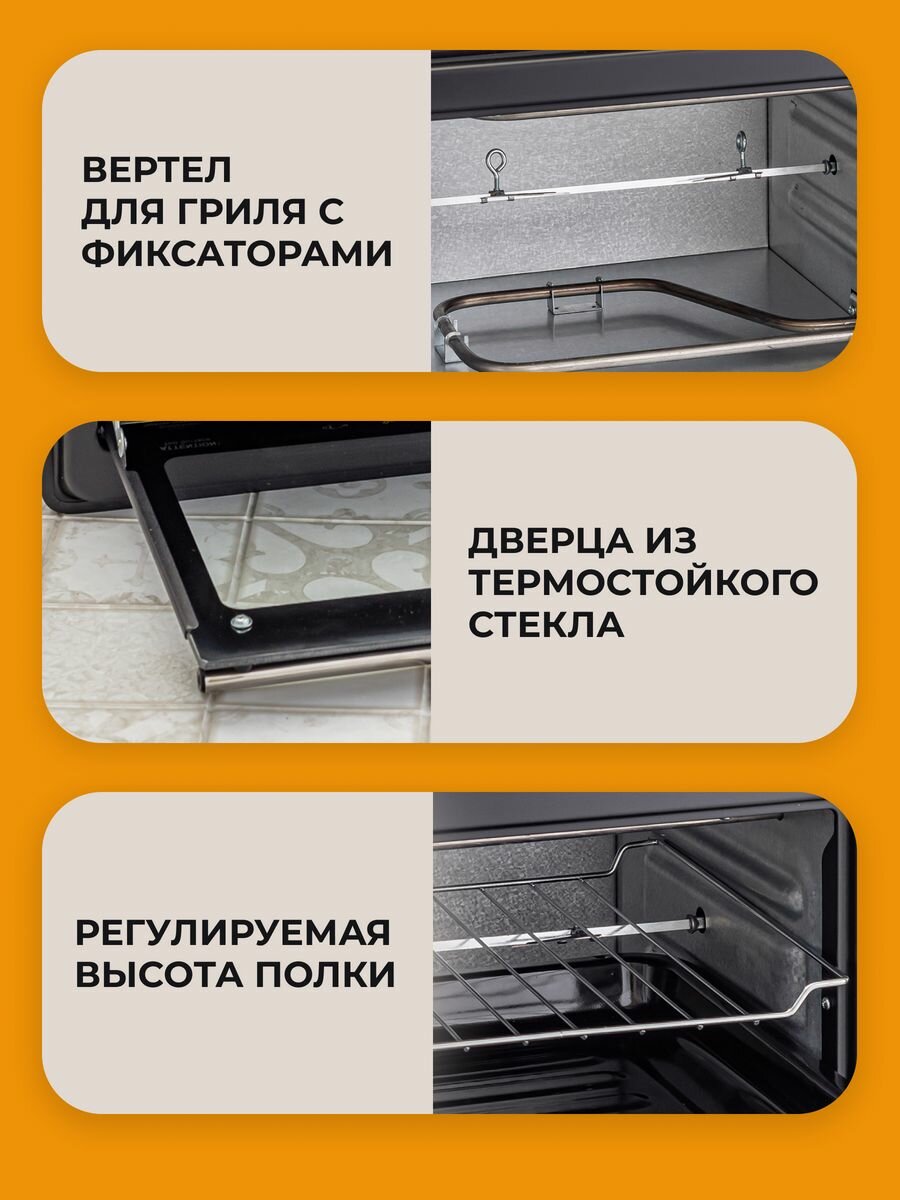 | Плюсы: | Механическое управление ( каждому своё), нижний нагрев, верхний нагрев, нижний+верхний нагрев, есть термостат, в комплекте решётка, противень, вертел, таймер. |