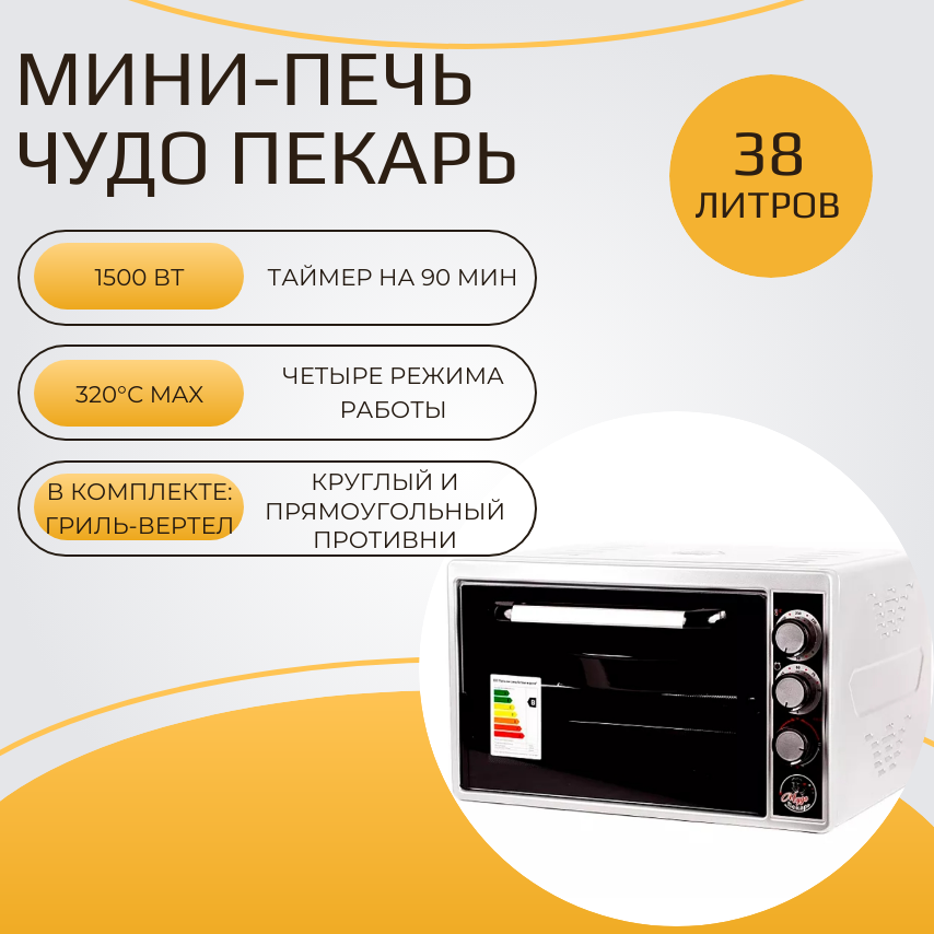Мини-печь "чудо пекарь" ЭДБ-0124/духовка электрическая настольная (цвет белый, 39 л, 1 противень, толстый нержавеющий ТЭН повышенной мощности, таймер, гриль, терморегулятор)