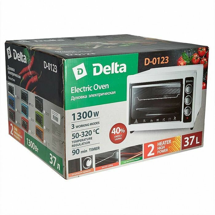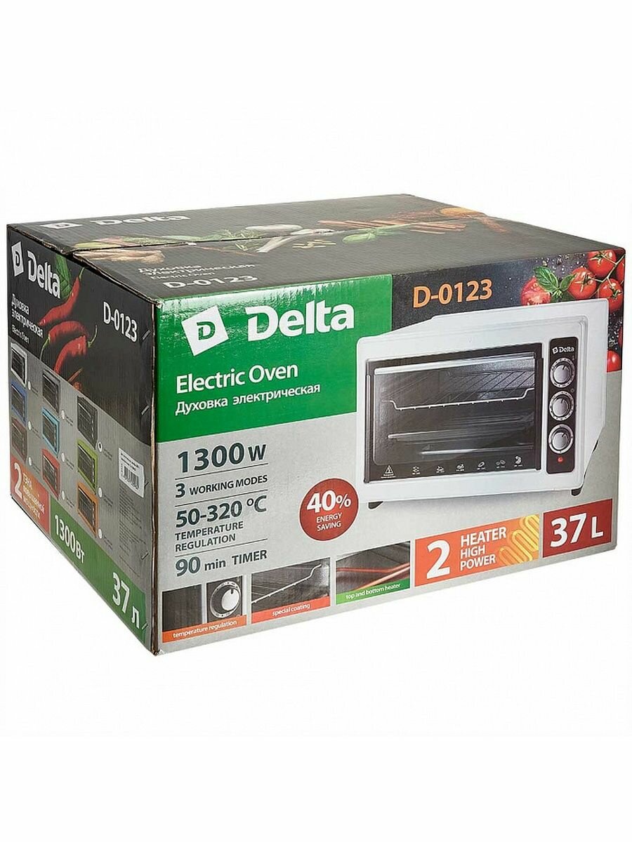 Духовка электрическая, Delta, D-0123, 37 л, 1300 Вт, с термостатом, тен повышенной мощности, 2 нагревательных элемента, белая