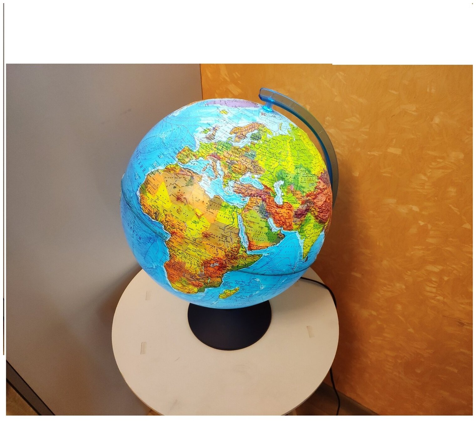 | Минусы: | Плохо вращается (вращается непосредственно корпус глобуса: на оси нет никаких втулок и т.п.), плохая печать - часто буквы сливаются с фоном. Идея совместить политическую и физическую карты хороша, но реализована плохо - читать сложно.