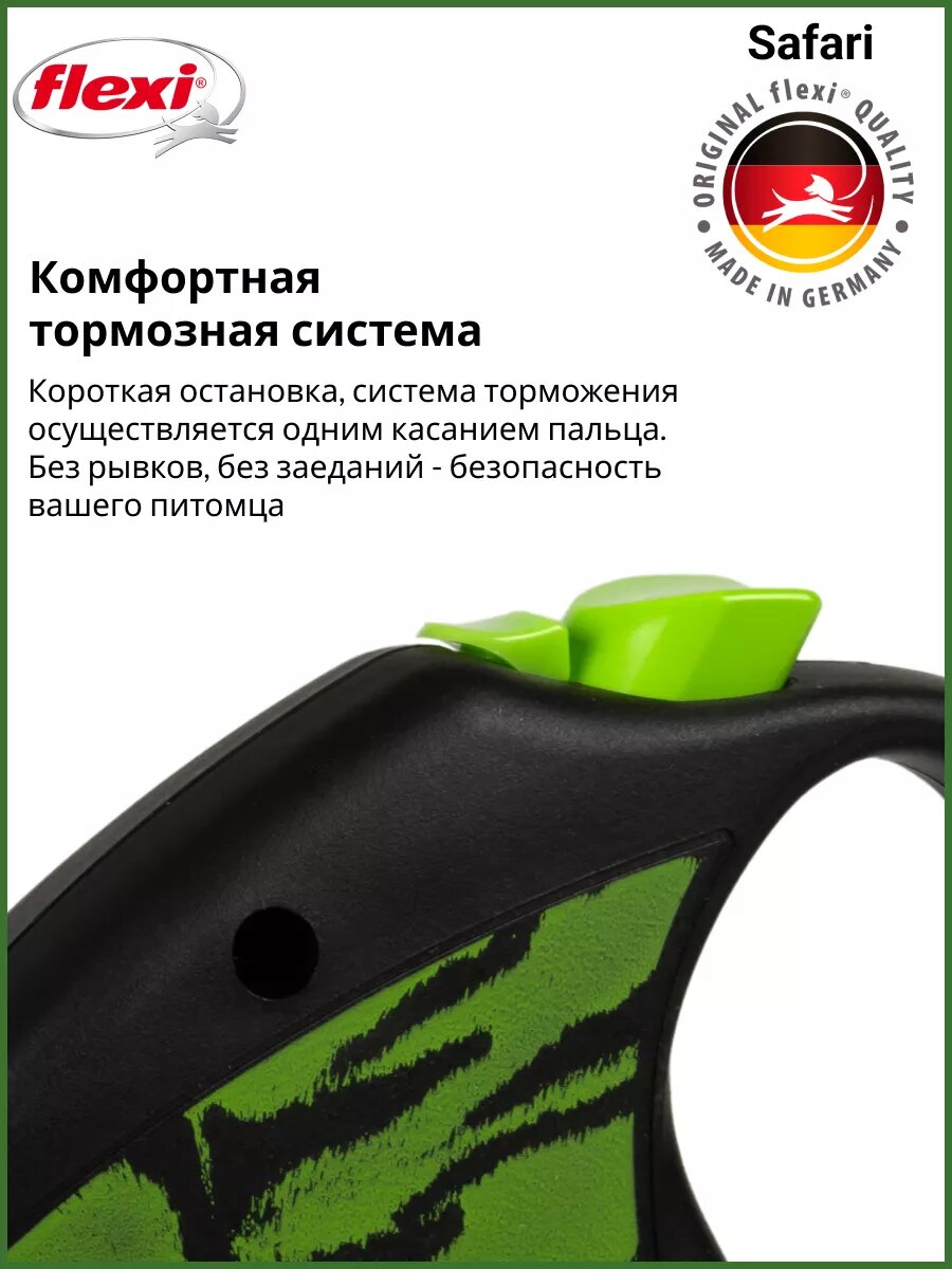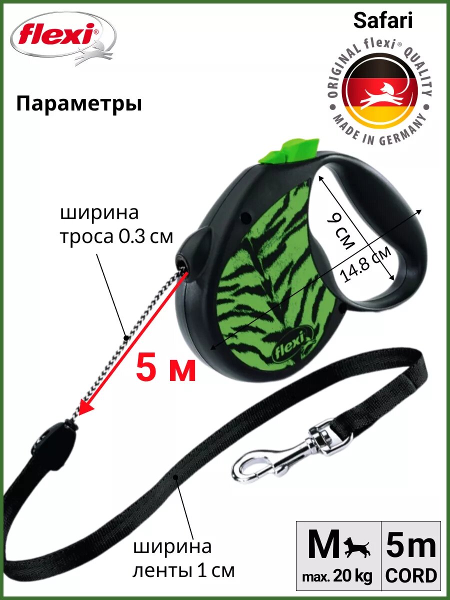 FLEXI SAFARI CORD тросовый поводок-рулетка для животных 5 м размер M зеленый тигр (1 шт)
